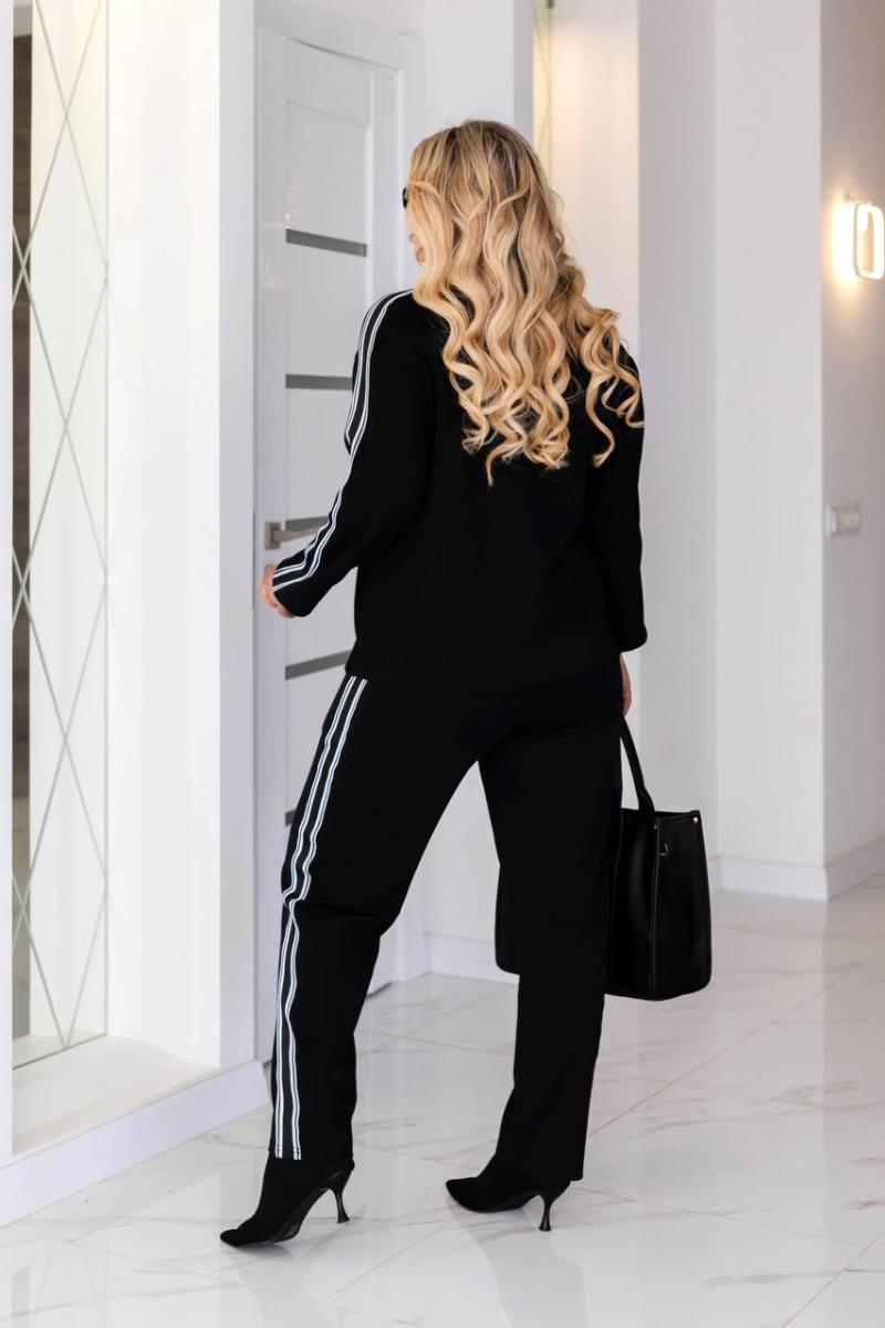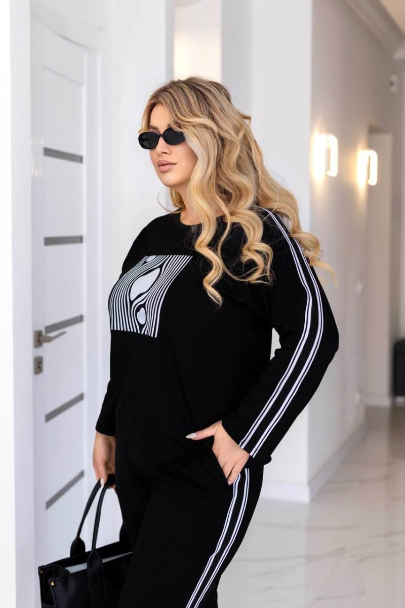 ▫️Верх костюма — світшот з якісної двонитки, прикрашений графічним малюнком у вигляді чорно-білих ліній. З боків рукавів лампаси. Низ костюма – вільні штани з аналогічними лампасами та кишенями з боків. Стиль костюма повсякденний, що підходить як для активного відпочинку, так і для прогулянок. Принт на грудях додає оригінальності, виділяючи костюм серед звичайних спортивних комплектів, робить силует витонченим. Також біла смужка на рукавах і штанах гармонійно доповнює загальний дизайн, додаючи динамічності і стилю.