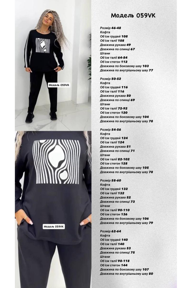 Розмір 54-56 Кофта Обʼєм грудей 124 Обʼєм талії 124 Довжина рукава 51 Довжина по спинці 71 Штани Обʼєм талії 82-102 Обʼєм стегон 128 Довжина по боковому шву 105 Довжина по внутрішньому шву 78