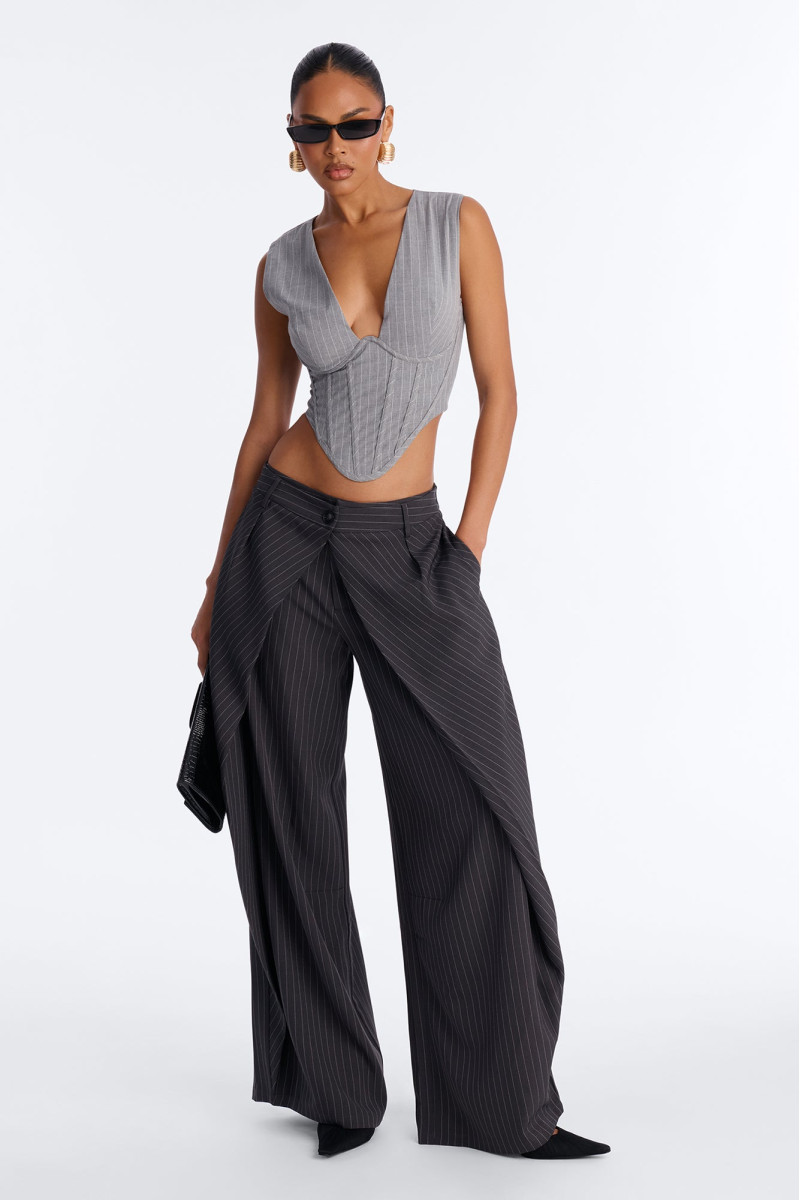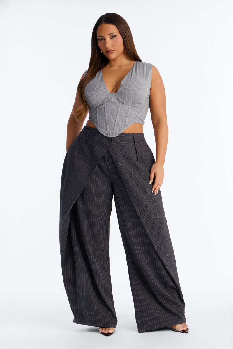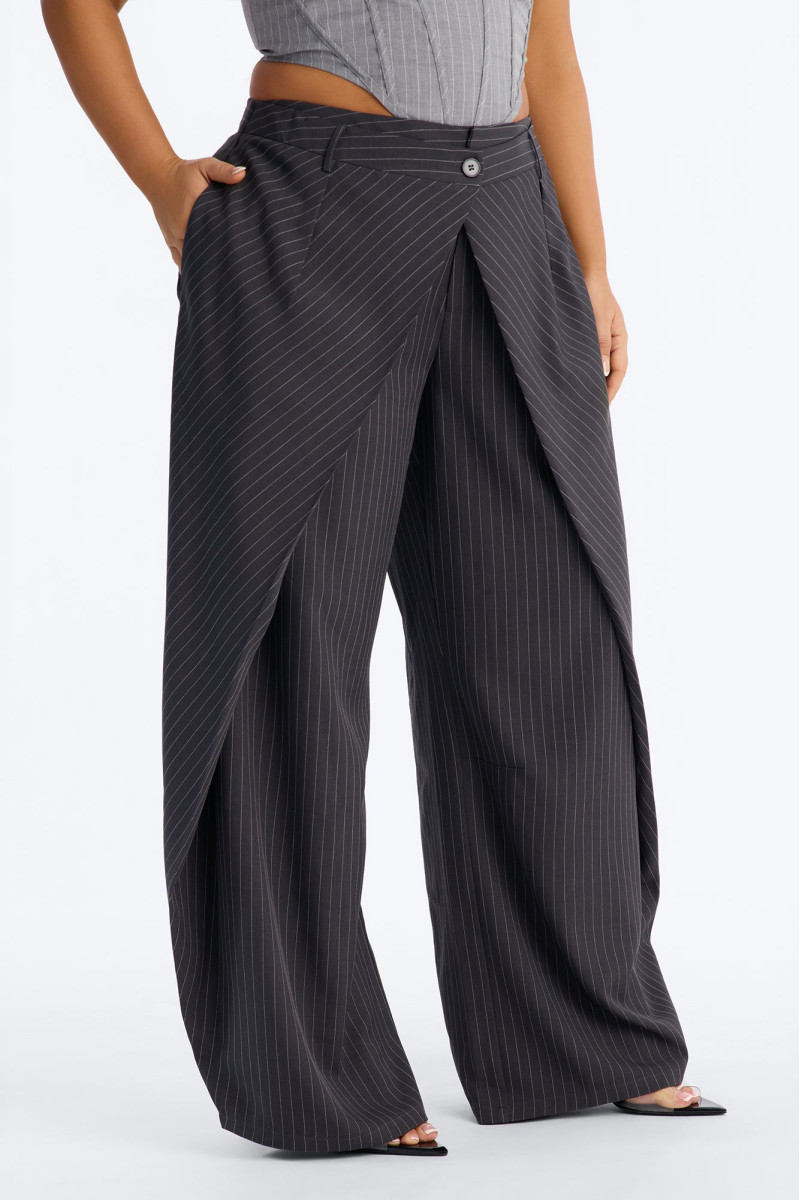 Штани із завищеною талією та широкими штанинами, що підкреслюють фігуру. Дизайн із запахом спереду додає нотку грайливості та елегантності. Довжина 33 дюйми ідеально доповнює образ, створюючи плавні лінії.