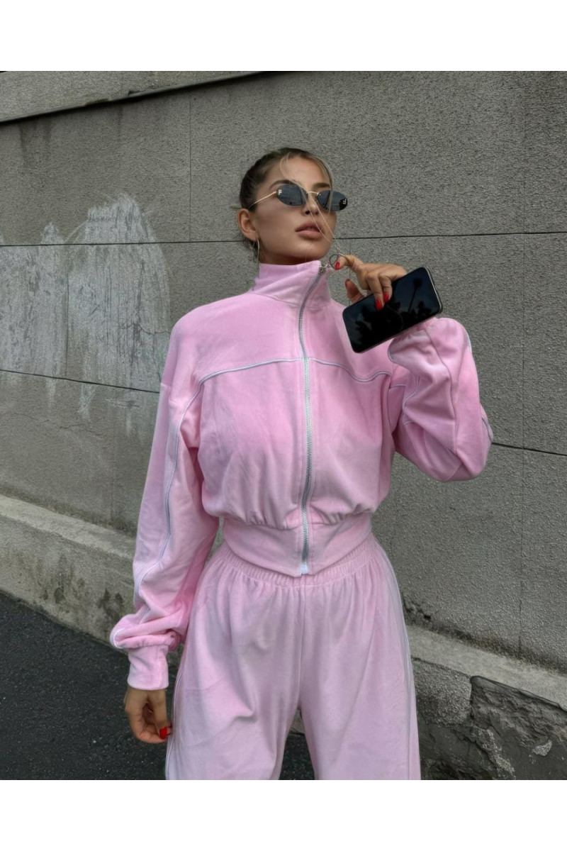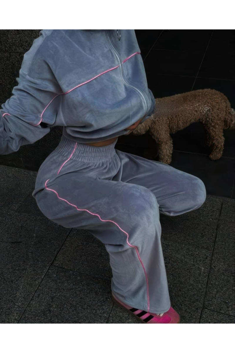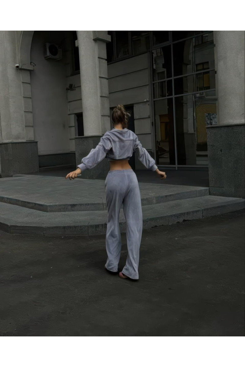 Спортивний костюм з велюру — стильно та гарно. Кофта на блискавці, штани кльош на високій посадці, прикрашений декоративними строчками. Комфортний та зручний look на кожен день.