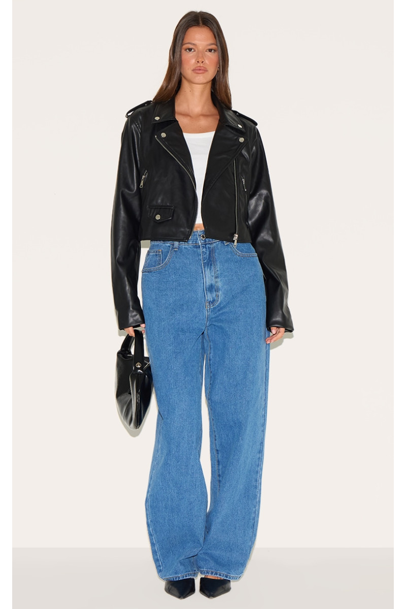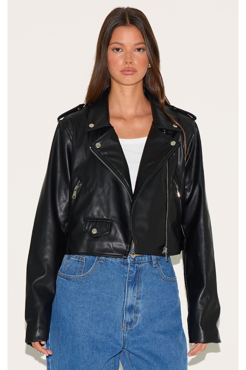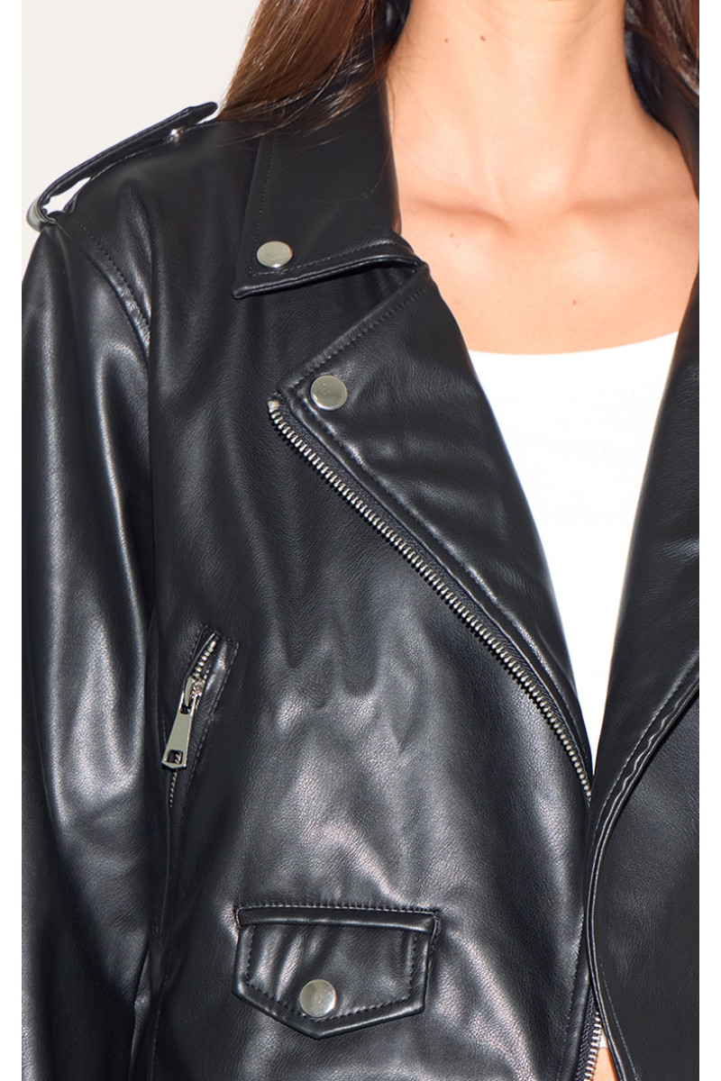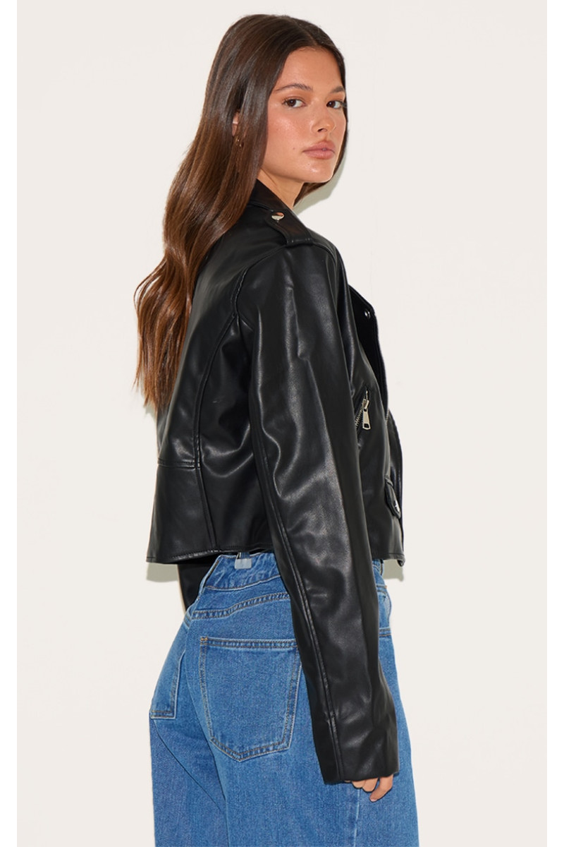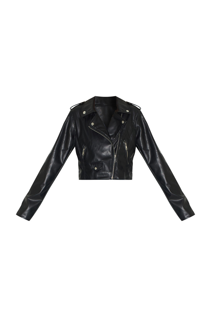 Чорна основна штучна шкіряна кишенька Деталі байкерська куртка