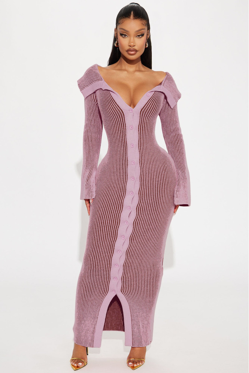 Стильна в'я зана сукня максі з довгими рукавами та спущеними плечима. Ця модель чудово підійде для створення затишних образів. Застібається на ґудзики спереду. Виготовлена з еластичної суміші 47% віскози, 32% поліестеру та 21% нейлону, що забезпечує комфортну посадку. Імпортний виріб.