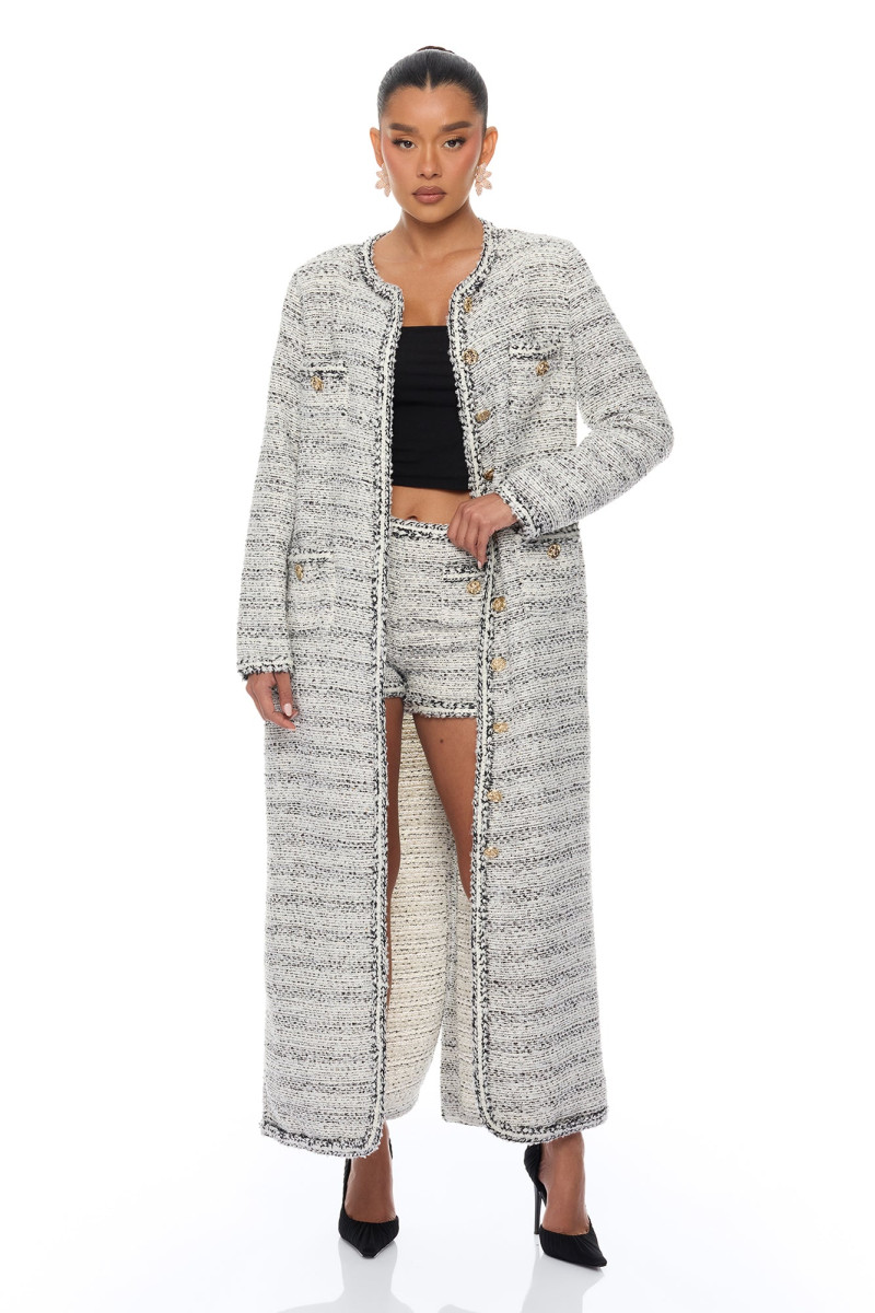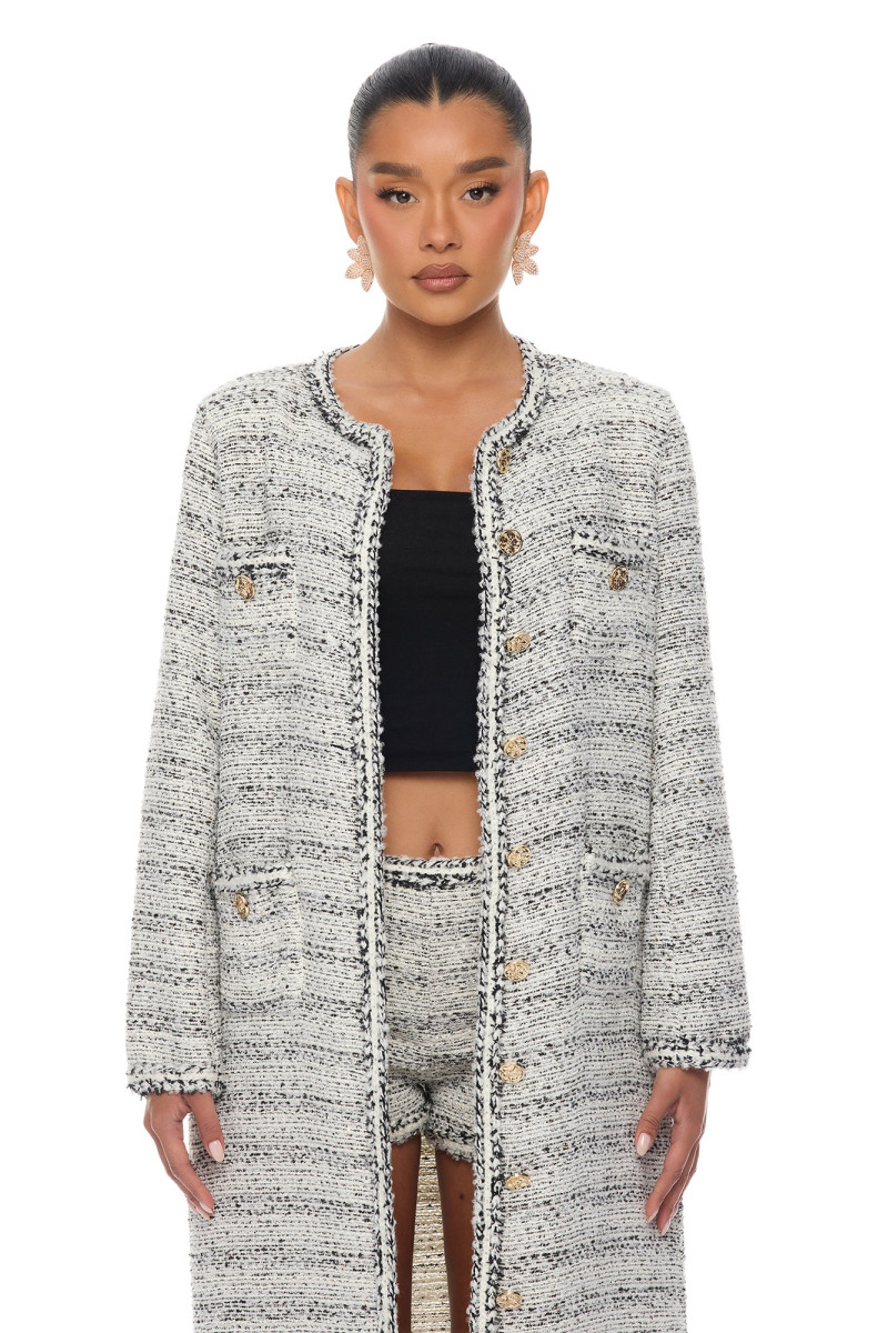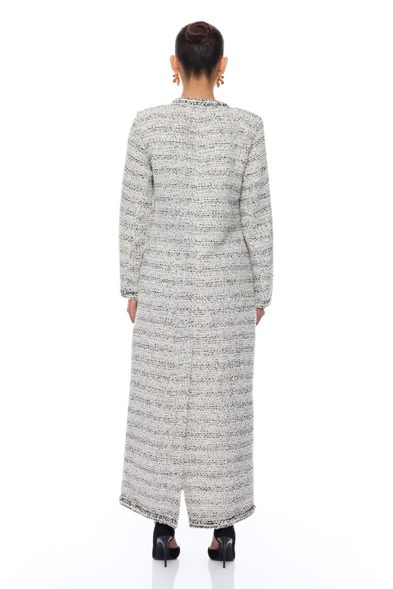 Розкішний твідовий кардиган "Каела" довжиною до колін – це ідеальне доповнення до вашого гардеробу. Його унікальний дизайн з витонченими декоративними елементами підкреслить вашу індивідуальність. Виготовлений з м'якого та приємного до тіла твіду, він забезпечує тепло та затишок. Чудово пасуватиме як до ділового костюма, так і до повсякденного вбрання.