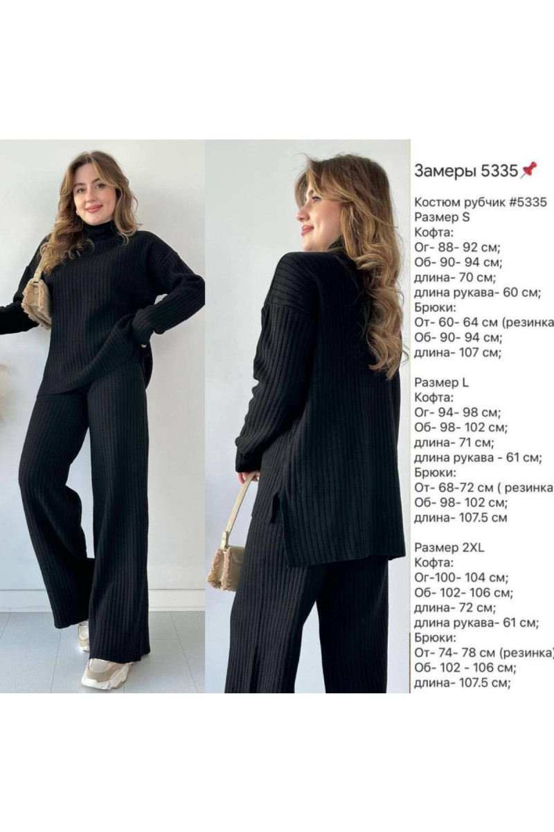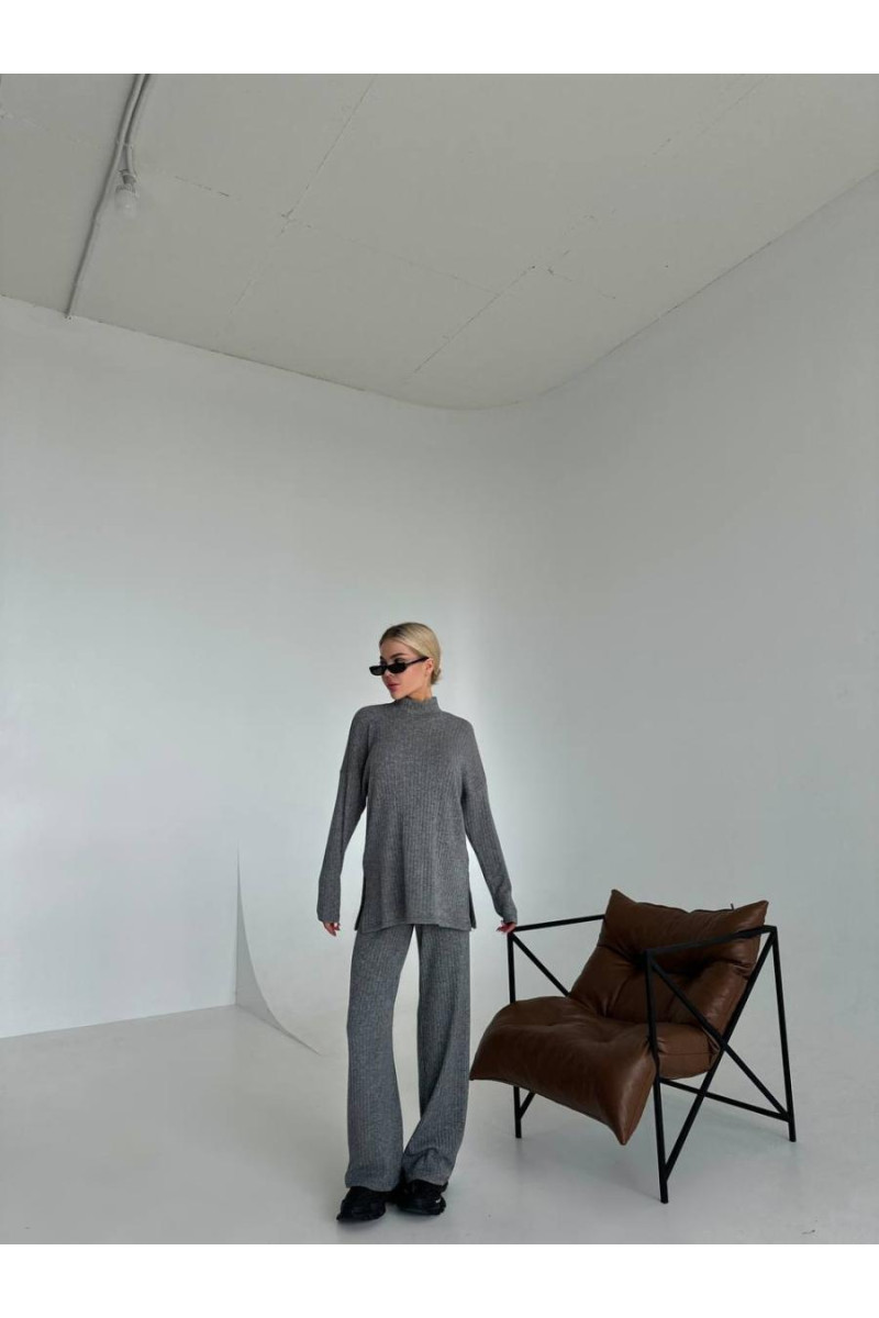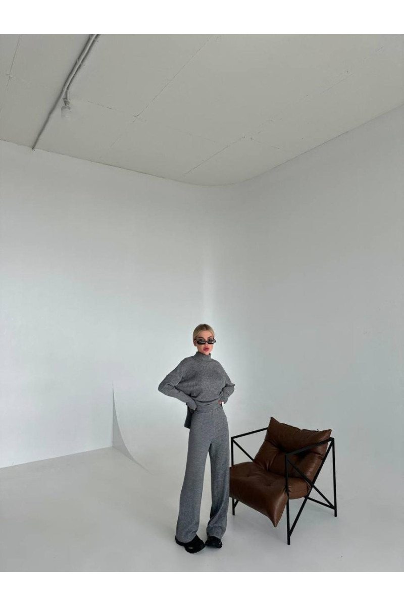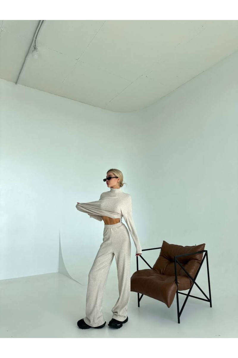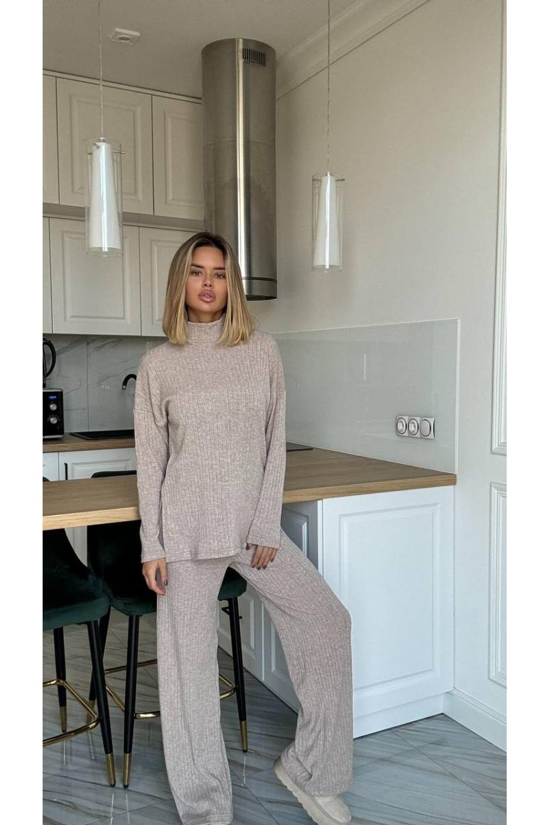 Модель Жіночий костюм Розмірний ряд 42-44;46-48;50-52 Кольори сірий, беж, шоколад та чорний Костюм з вільними по крою брюками, у талії передбачена еластична вставка для комфорту