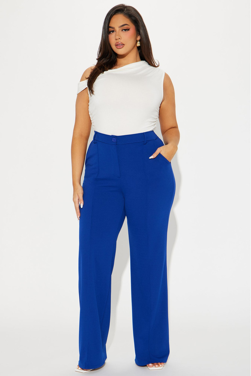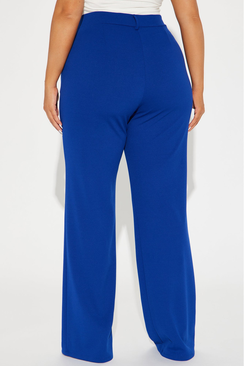 Висока посадка, застібка на ґудзик та блискавку, широкі штанини. Декоративні складки спереду додають елегантності. Тканина тягнеться, забезпечуючи комфорт протягом усього дня. Через особливий процес фарбування кожен виріб є унікальним. Виготовлені з 95% поліестеру та 5% спандексу.