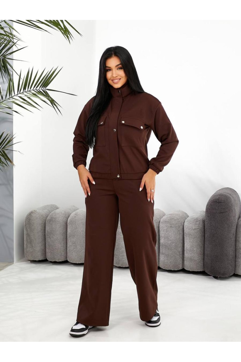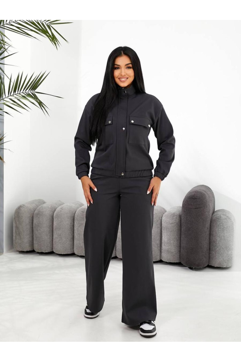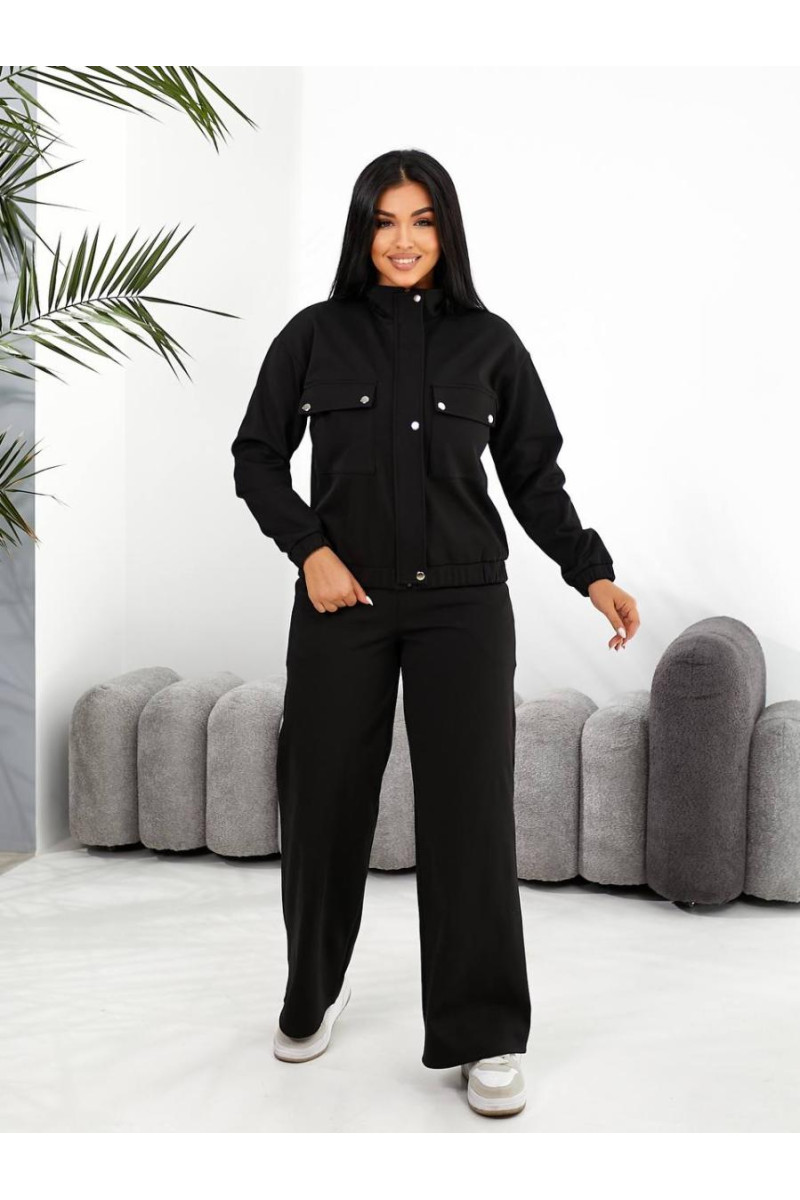 МОДЕЛЬ ‼️МІЖСЕЗОННИЙ ТРЕНДОВИЙ КОСТЮМ з бомбером та прямими брюками. ▪️Бомбер вільного крою має довгий рукав з подовженою лінією плеча по низу манжет на резинці. Комірець стійка застібка на блискавці і планка на кнопках. Має накладні нагрудні кишені з клапаном. По низу бомбера резинка. ▪️Брюки прямого крою, високої посадки, втачний пояс з широкою резинкою і шнурком для зручного фіксування на талії. В бокових швах косі кишені. Ідеально сидять на фігурі і гарна посадка