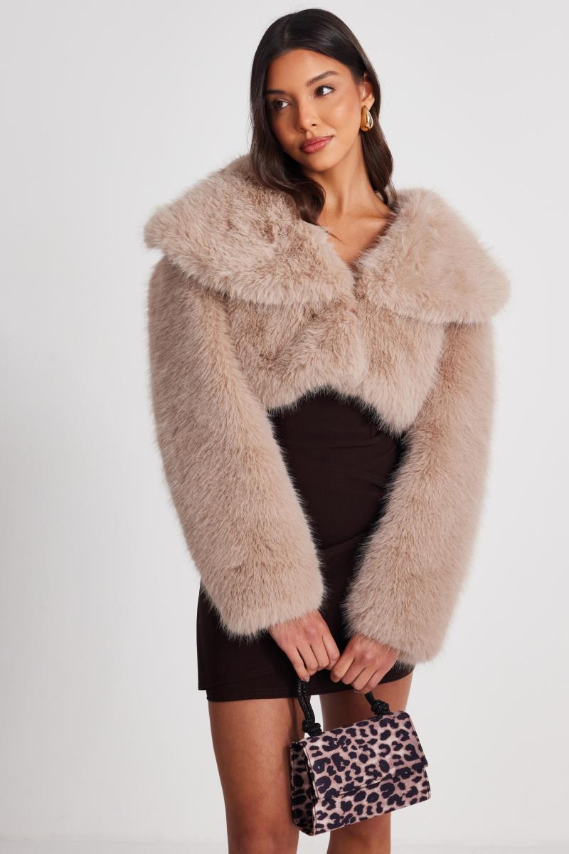 Цей обрізаний піджак має штучний хутряний комір і довгі рукави, що забезпечує тепло та стильне прикриття для осінніх та зимових виїздів. Ідеально підходить для вбраних випадків та нічних подій.