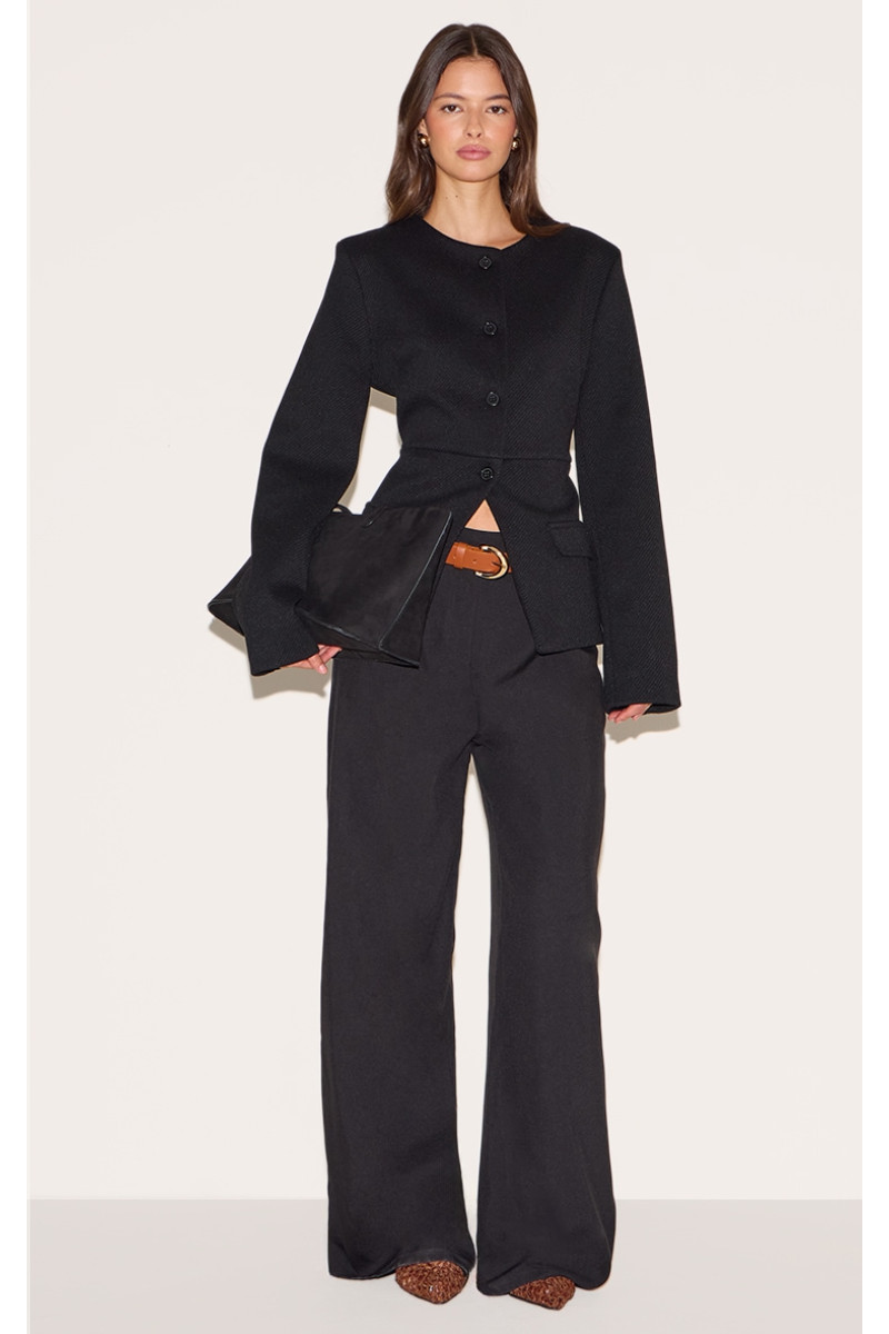 Створений з чорного матеріалу з кріпленням кнопки вгору, пристосуванням до довгих ліній та деталізацією без комірів. Команда цієї чорної кнопки вгору вгору без комірця без комірців з деякими широкими штанами для ніг та парою підборів для підвищеної обробки. Довжина приблизно 48,5 см/ 19 "(на основі розміру вибірки uk 8) Модель носить розмір UK 8/ EU 36/ AUS 8/ US 4MODEL Висота: Fitted BlazeCrocly Вечір